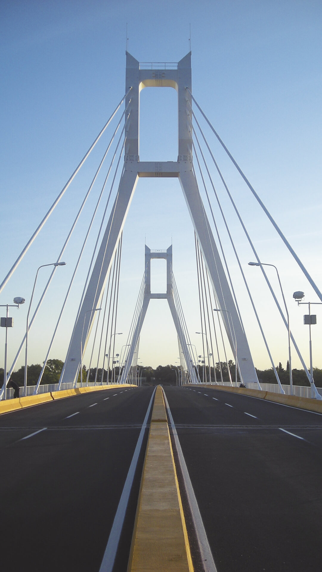 Puente atirantado de 211 m de longitud con dos viaductos de 51 m cada uno. Ancho de tablero: 18.6 m. Dos pilas metálicas principales. 40 obenques - tablero de hormigón postensado.
